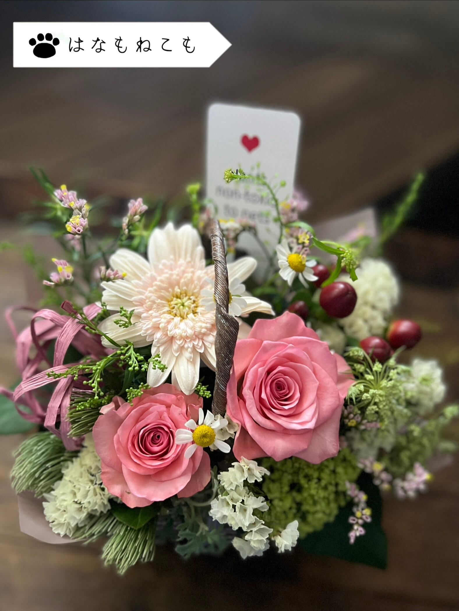 バラやガーベラを中心に、季節の小花とナチュラルなグリーンを合わせたやわらかく温もりのあるアレンジです